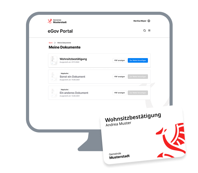 Andrea bekommt ihre Wohnsitz-bestätigung ins eGov-Portal ihrer Gemeinde ausgestellt und kann den Nachweis ganz einfach zur Wallet hinzufügen.