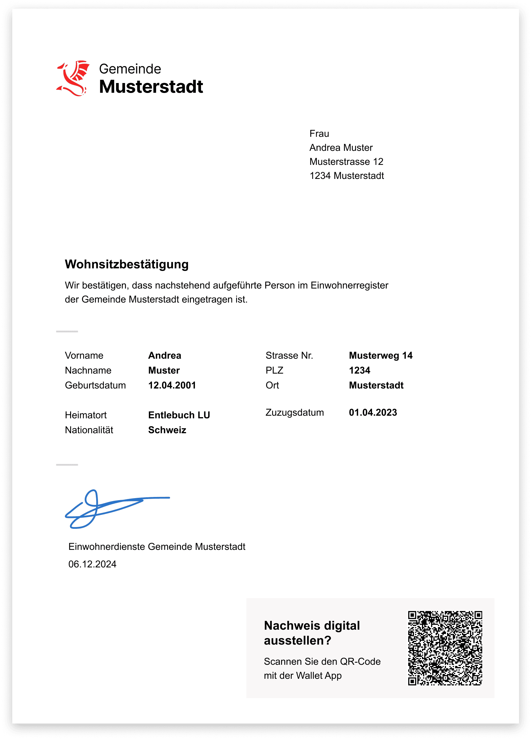 Mit dem QR-Code im PDF der Wohnsitzbestätigung kann sich Andrea auch nachträglich einen digitalen Nachweis in die Wallet ausstellen lassen.